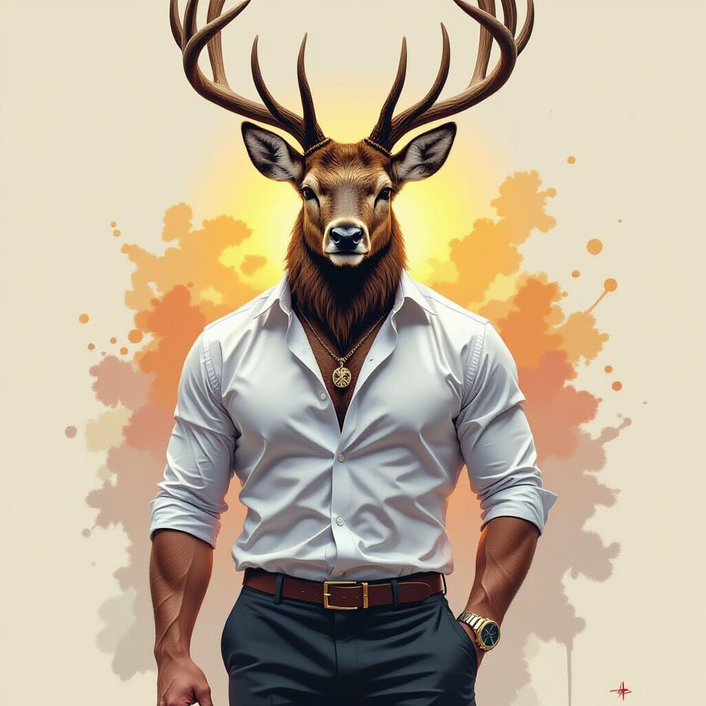 This image shows a stag-headed man in an open shirt and dress pants standing with an eagle-headed man holding a glass of whisky. It is a hyperrealistic splash art concept with dramatic lighting.