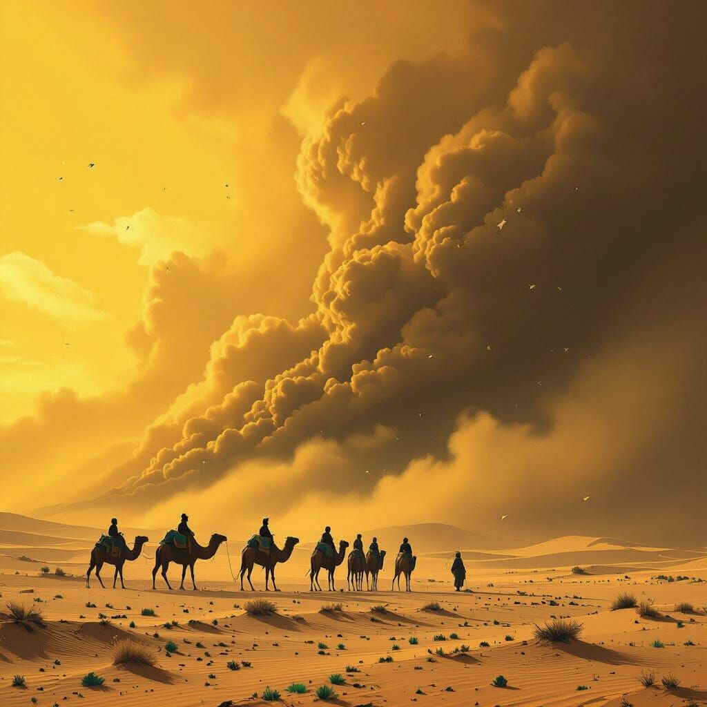 A desert village and camel caravan are consumed by a huge brown sandstorm filled with white and green debris. The image features dramatic landscape elements.
