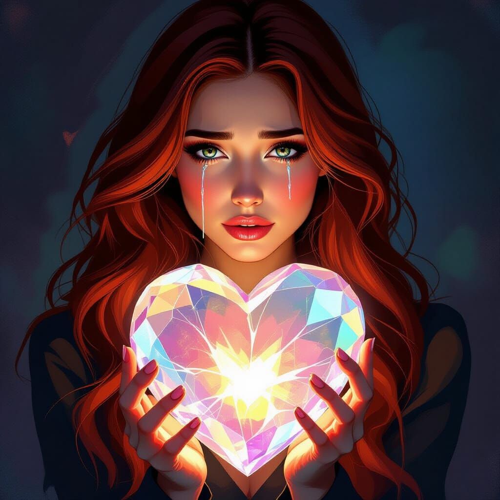 This image shows a woman with auburn hair, tears in her eyes, holding a broken heart crystal. Ethereal light illuminates her face, rendered in a dramatic, painterly style with rich colors.