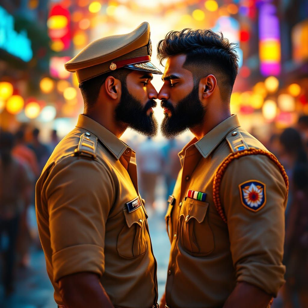 A striking picture of two handsome Indian men sharing a kiss in a public setting. The image features hyperrealistic textures, rich colors, and dynamic lighting, creating a sense of intimacy.