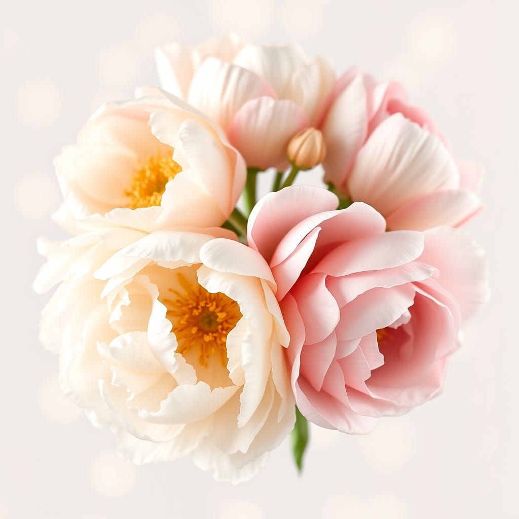 This image showcases a hyperrealistic digital illustration of a delicate bouquet featuring gold, white, and blush pink peonies and roses. Soft studio lighting highlights the intricate petals, creating an elegant, minimalistic composition with a gentle bokeh effect.