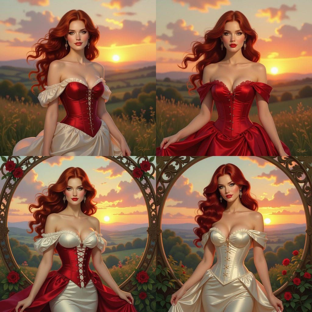 This image shows a regal woman with flowing red hair wearing a corset dress, set against a lush landscape at sunset. The artwork features smooth skin and a shiny satin texture, reminiscent of watercolor painting.