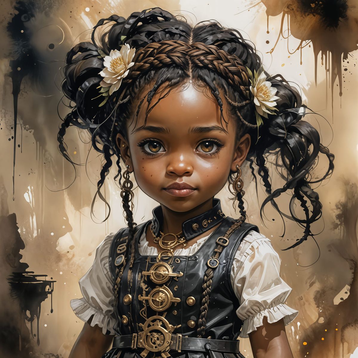 This image shows a watercolor illustration of a cute African American chibi toddler in steampunk clothing. The portrait features detailed black braided hair and light brown eyes with dramatic lighting, in a maximalist aesthetic.
