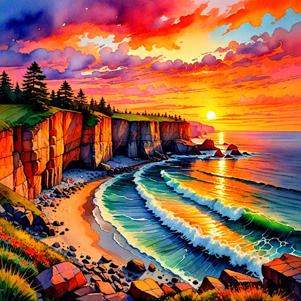 A striking picture of a vibrant sunset over a rugged cliffside. The watercolor painting captures the dynamic range of the bright red and orange hues.