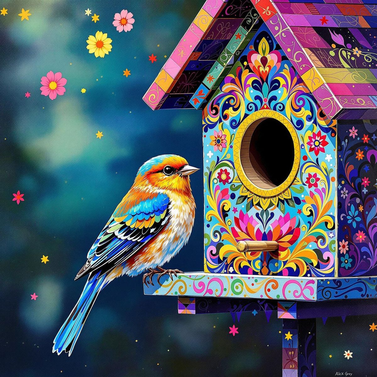 This image shows a colorful painting of a bird perched on a birdhouse. The birdhouse is intricately designed with many bright colors, and the bird appears content and comfortable.