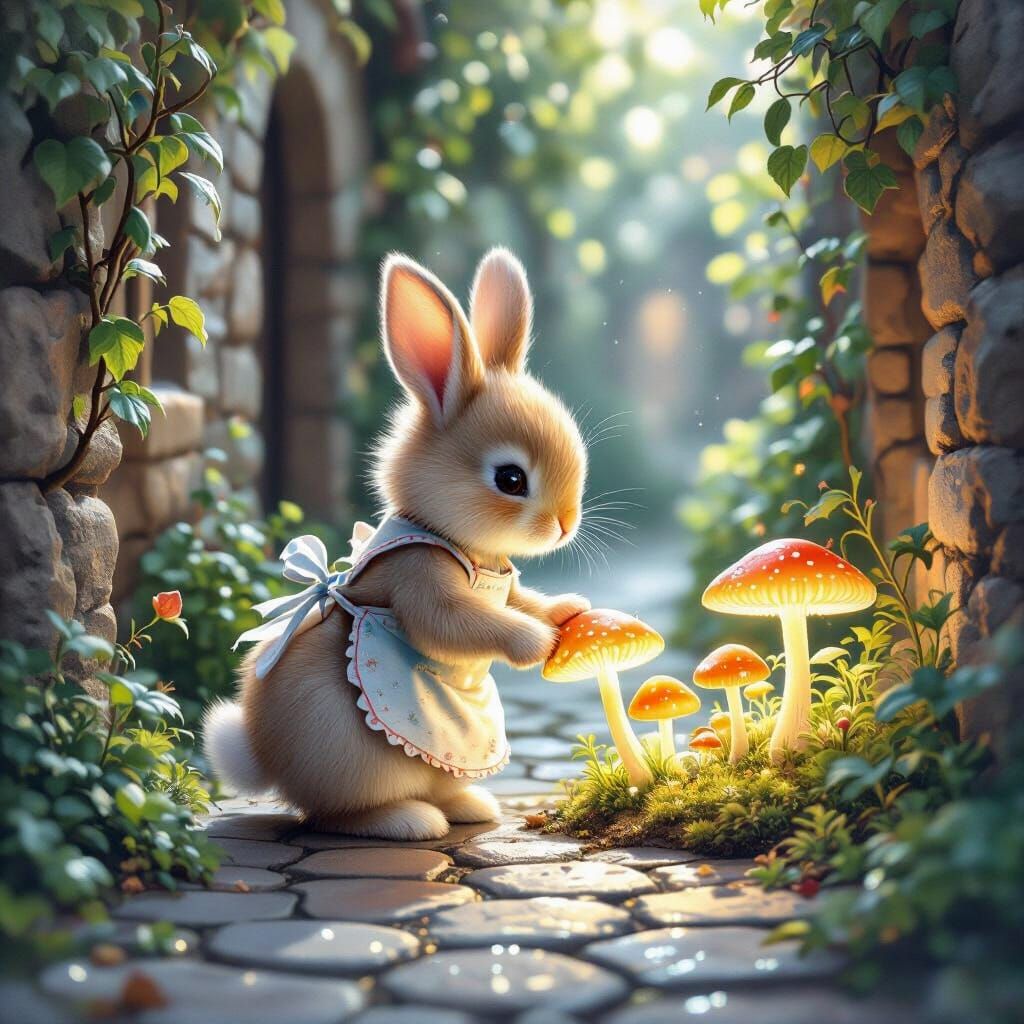 A tiny, fluffy bunny wearing a miniature apron, carefully tending to a glowing mushroom garden beside a cobblestone alleyway. Sunlight filters through the narrow gap between ancient buildings, illuminating dew-kissed leaves and delicate, bioluminescent flora. The scene is rendered with soft, painterly strokes and a dreamy style, reminiscent of classic storybook illustrations with a touch of surreal artistry.