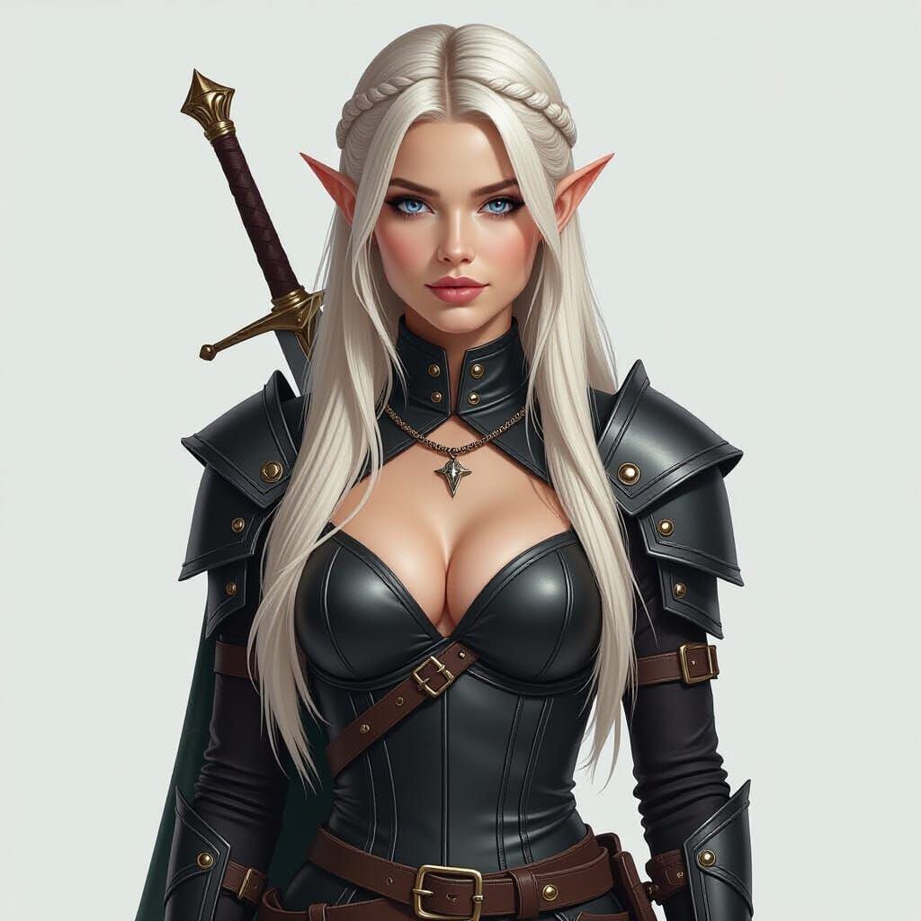 This image shows a photorealistic halfling rogue in leather armor. The slim, agile warrior has long blonde hair and blue eyes. She stands confidently against a white background.