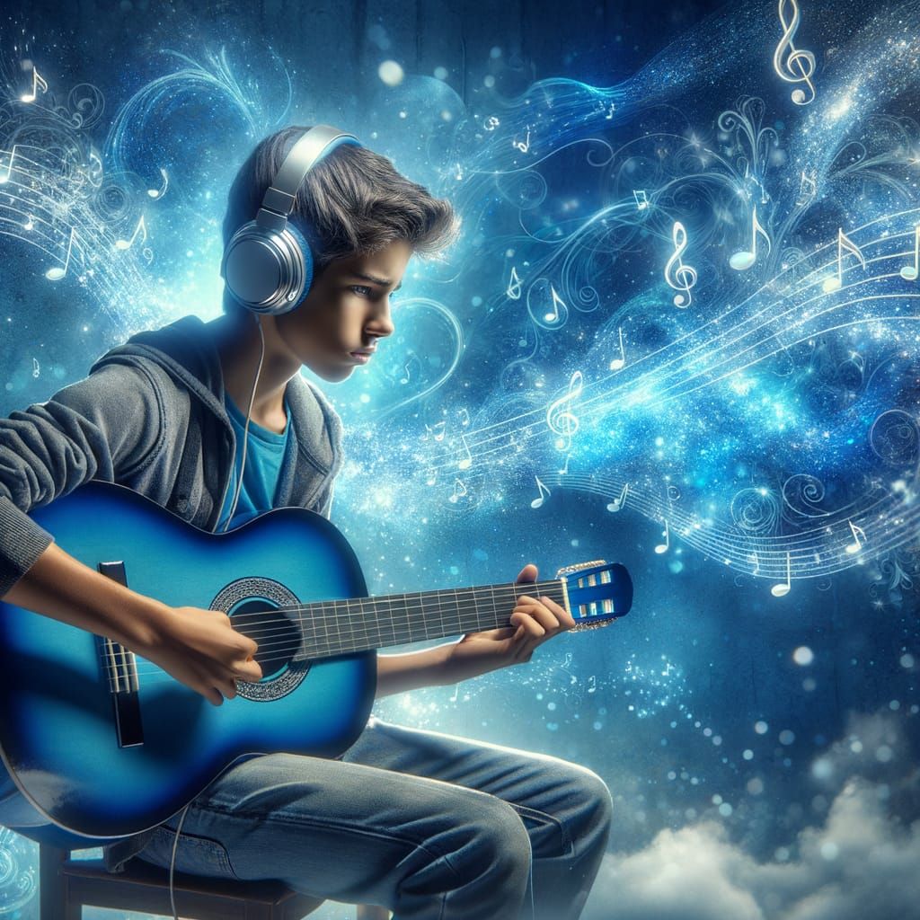 This image shows a Hispanic teenager absorbed in music. He's wearing silver headphones, playing a sky-blue guitar, with musical notes swirling around him in a magical, predominantly sky-blue and silver scene.