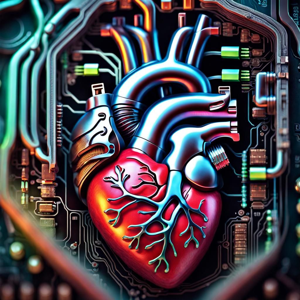 internal circuitry of a cell phone tech and internal organs collide, with a extraordinarily detailed photorealistic anatomical human heart, chips, processor, heart lungs brain, bold bright colors, hr giger, lovecraft, photorealistic, dark, horror, macabre