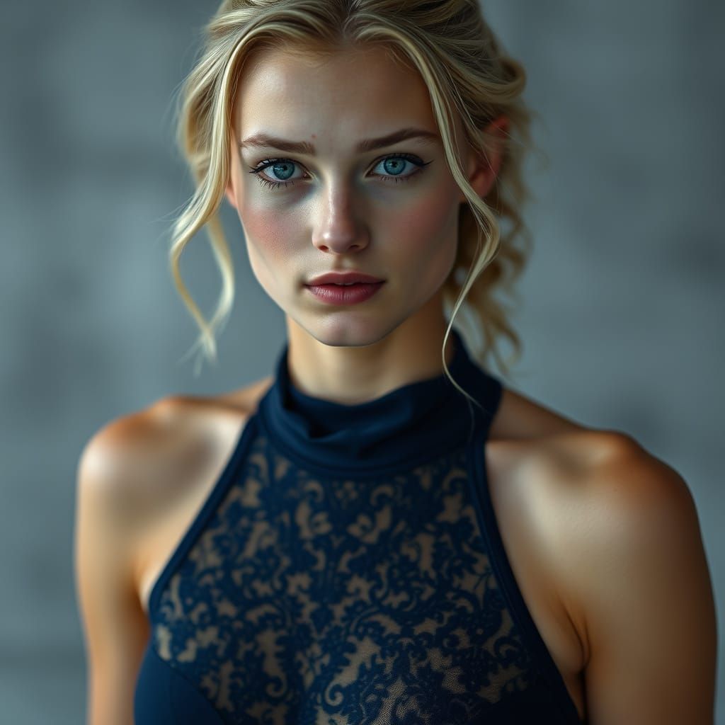 This stunning portrait captures a young French woman in a navy blue swimsuit with intricate lace-inspired embroidery, set against a soft, blurred background. Shot in a cinematic style reminiscent of master photographers, this image showcases ultra-detailed realism and subtle texture.