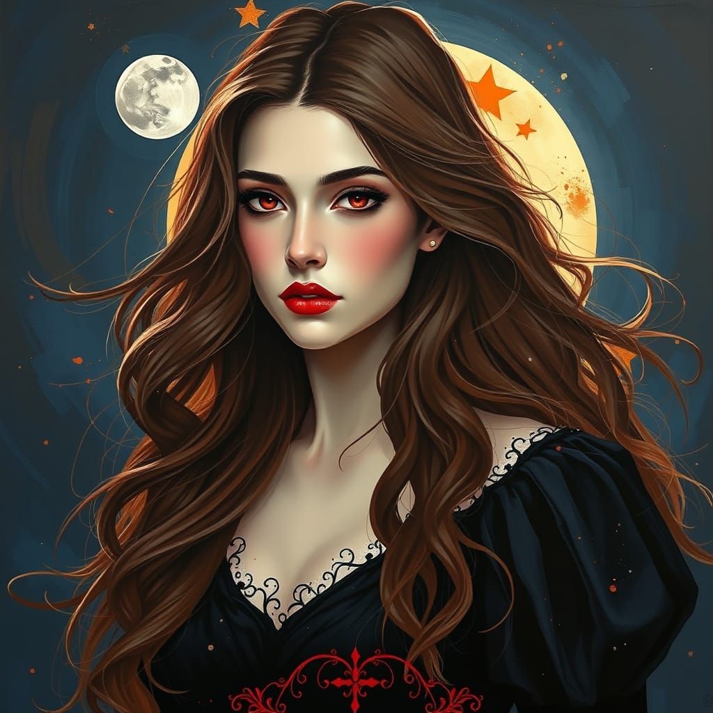 This image shows a woman with long, wavy brunette hair and ruby eyes. She wears a dark dress, rendered with graffiti and splash art techniques in high contrast and polychromatic colors.