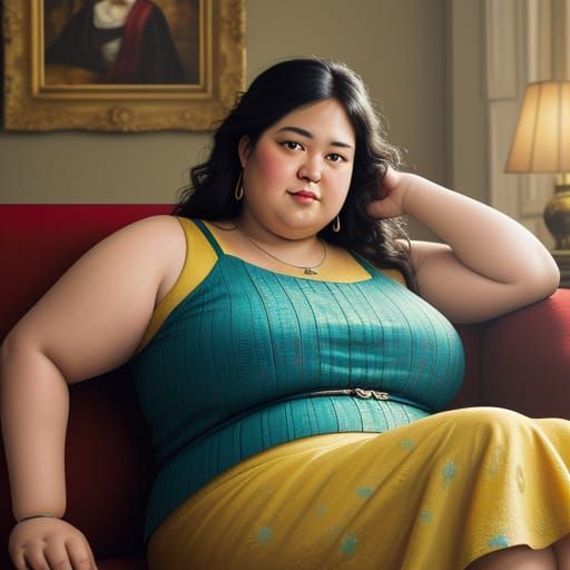 This image shows a medium shot of a woman sitting on a couch in warm golden light. This oil painting is depicted with thick brushstrokes and soft textures, creating a realistic portrait.