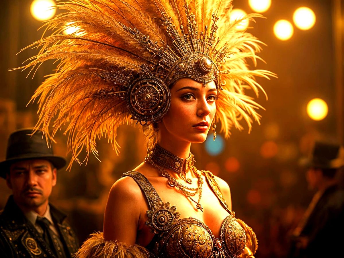 A striking picture of a steampunk cabaret dancer wearing an ornate feathered headdress. The vintage performer is adorned in shimmering sequins and lit by dazzling stage lights, rendered with hyper-realistic detail.