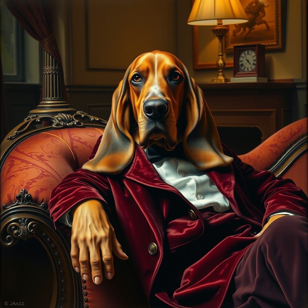 An oil painting of a distinguished Basset Hound in a velvet smoking jacket, resting on an antique chaise lounge. The artwork features warm, cinematic lighting and captures the hound's soulful expression.