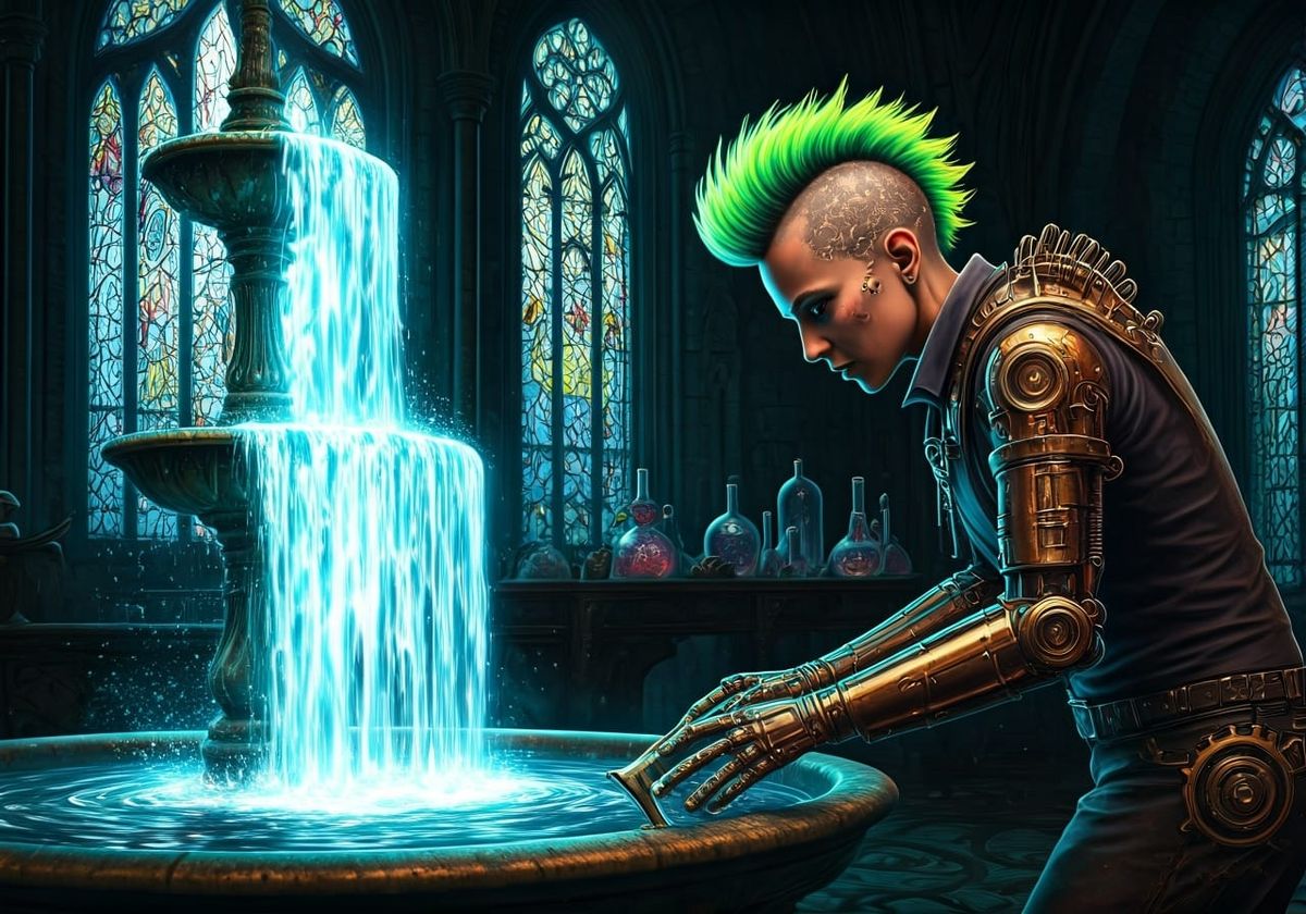 A striking picture of a dieselpunk alchemist gathering liquid starlight at a gothic lab fountain. The alchemist has neon-green hair and glowing cybernetic enhancements, in a steampunk fantasy aesthetic.