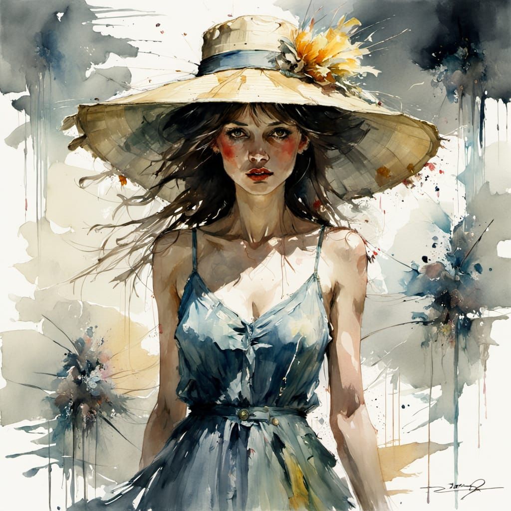 A watercolor painting of a woman in a hat and sundress. The artwork captures a sense of breezy fun and action with dramatic lighting, created with rough paint strokes and textures.