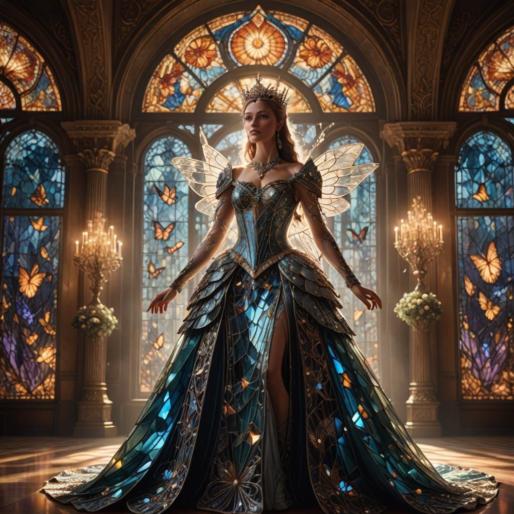 A fairy queen with translucent wings adorned in a breathtaking gown that appears to be woven from pure, shimmering stained glass dress