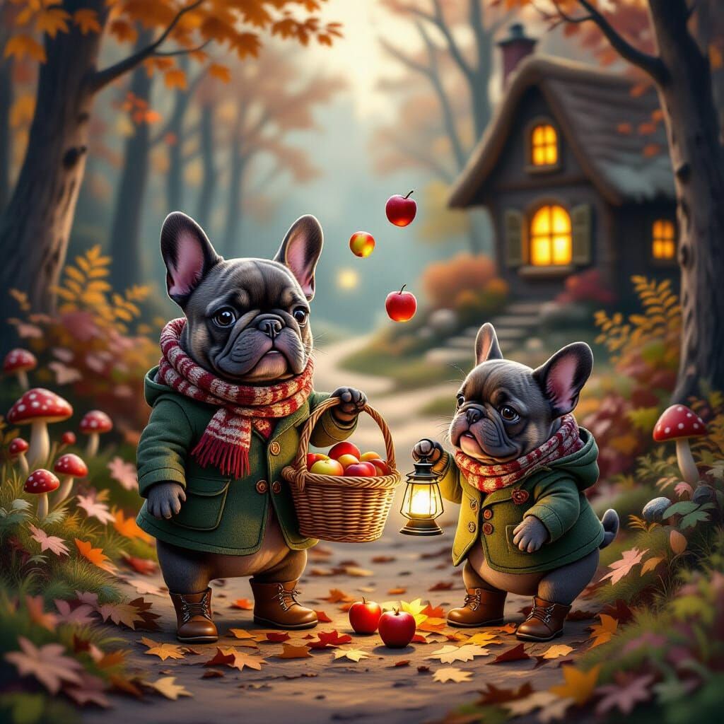 This image shows three charming anthropomorphic French Bulldogs dressed in autumn attire, holding apples and a lantern on a forest path. A fairytale illustration style with warm, enchanting lighting.
