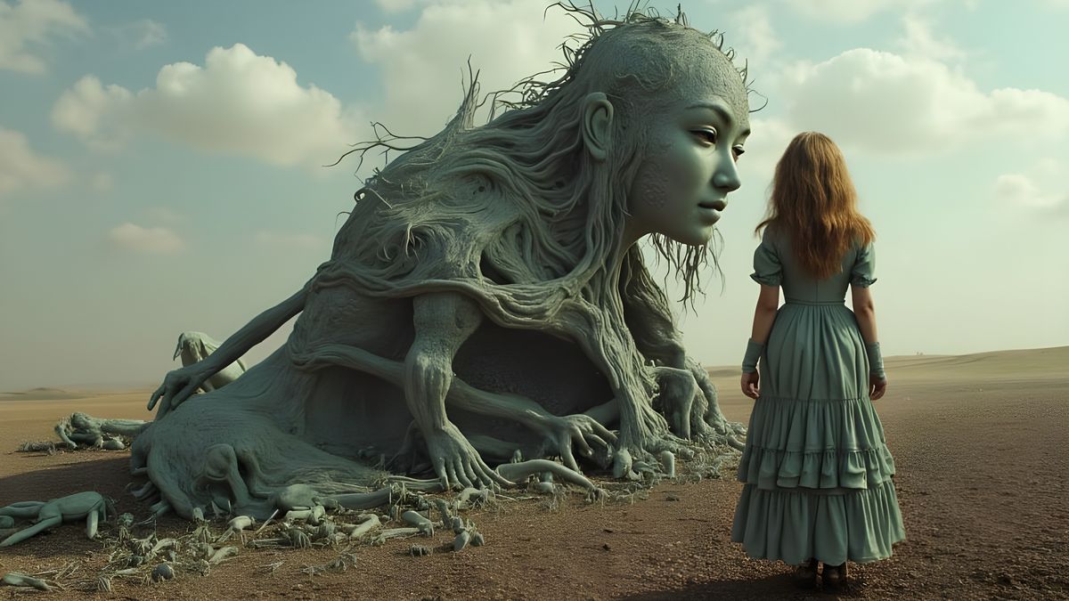 This image shows a woman-shaped building being constructed by extraterrestrial life forms amidst a swarm of insects. The scene is depicted in a futuristic, cyberpunk-inspired aesthetic with vibrant colors and detailed textures.