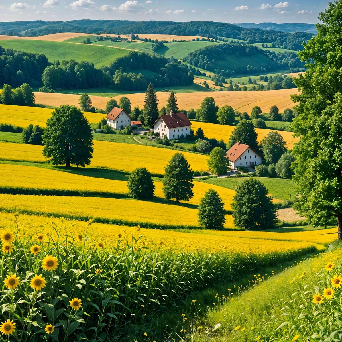 This image shows a vibrant summer landscape. The AI generated image evokes the feeling of warmth and abundance in a colorful countryside scene.