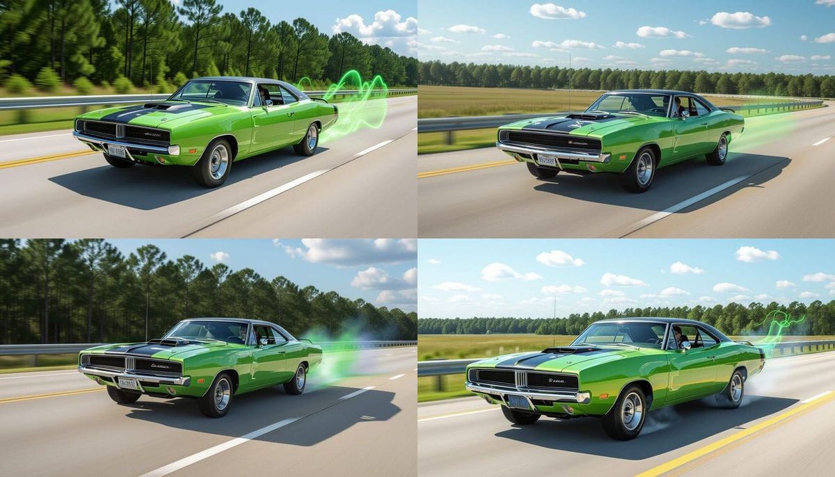 A vivid neon green 1969 Dodge Charger muscle car races along a rural Southern highway. Capturing a retro aesthetic with motion blur and dynamic lighting, the image evokes a sense of vintage nostalgia.