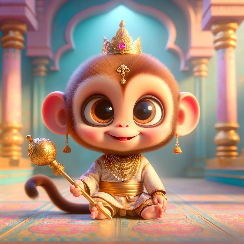 This image shows a cartoon baby monkey deity with a golden crown and mace, seated in a pastel temple courtyard. The artwork features rich colors, intricate details, and soft lighting, reminiscent of fantasy concept art.
