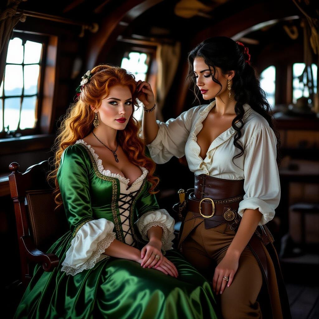 Cinematic film still of a pirate captain and a Spanish noblewoman aboard a galleon. Features dramatic lighting, vibrant colors, and a rich, atmospheric feel, evoking an 18th-century seafaring epic.