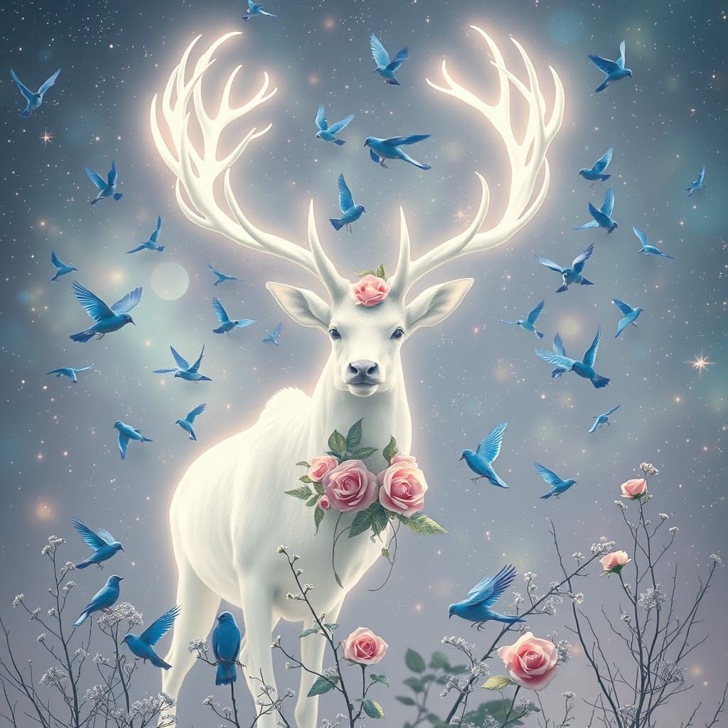 A striking picture of a glowing white stag with rose-entwined antlers, encircled by bluebirds under a bioluminescent sky. The artwork has a dreamlike quality, reminiscent of ethereal landscapes.