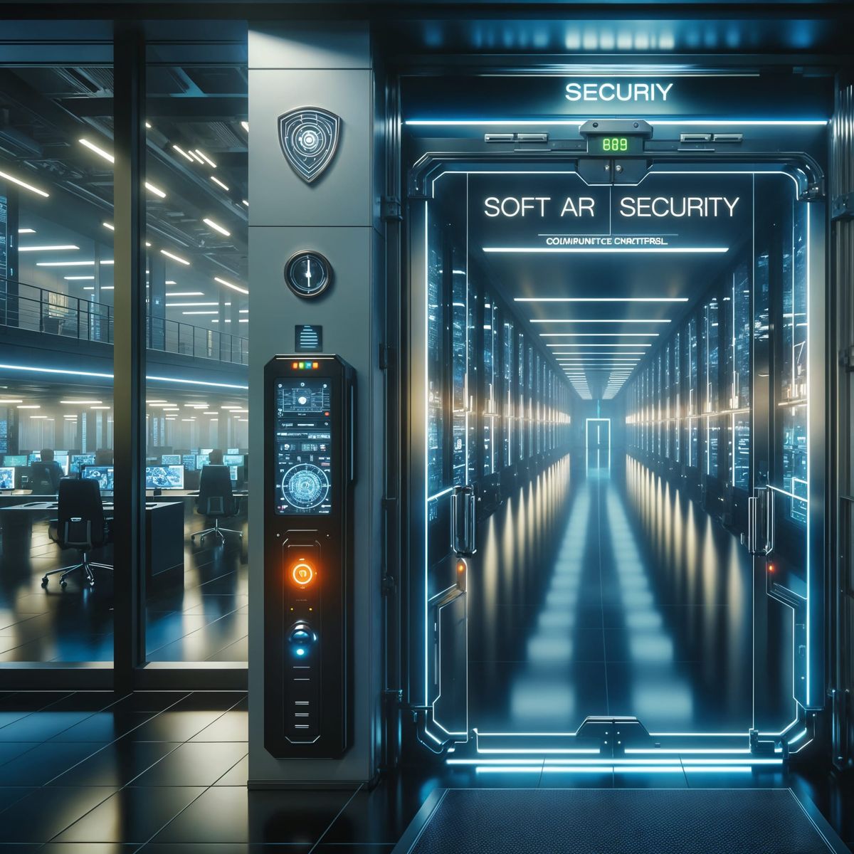 This image shows a reinforced glass door with glowing AR security warnings in a futuristic corporate building. The scene captures a sterile, high-tech environment in a city resembling New Orleans, depicted in a cyberpunk aesthetic.