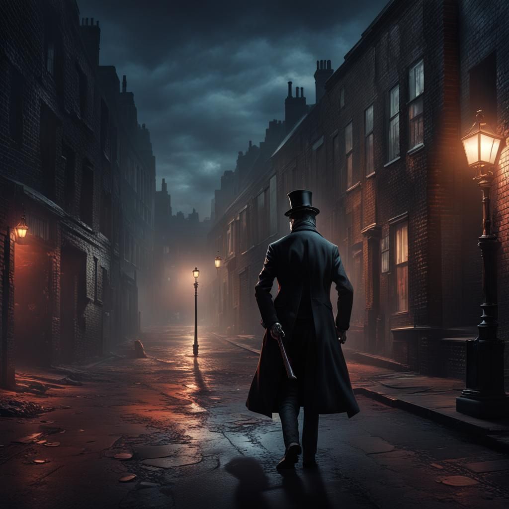 A hyperrealistic splash art image of Jack the Ripper investigating a crime scene, possibly his own. The mid shot utilizes dramatic side lighting and a colorful background.
