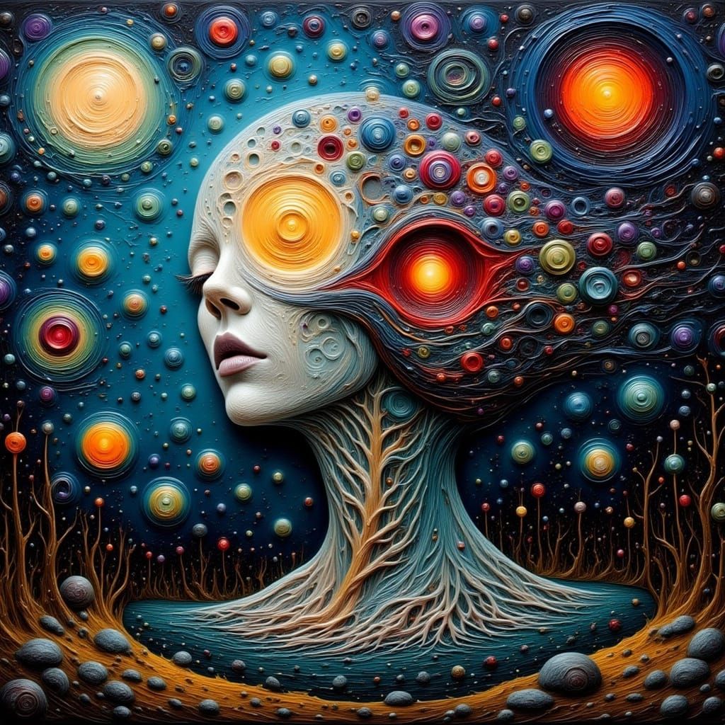 This image depicts a central contemplative face from which many other faces expressing various emotions emerge, set against a backdrop of binary code and mosaic art. It blends dreamscape and strangecore aesthetics with intricate detail.