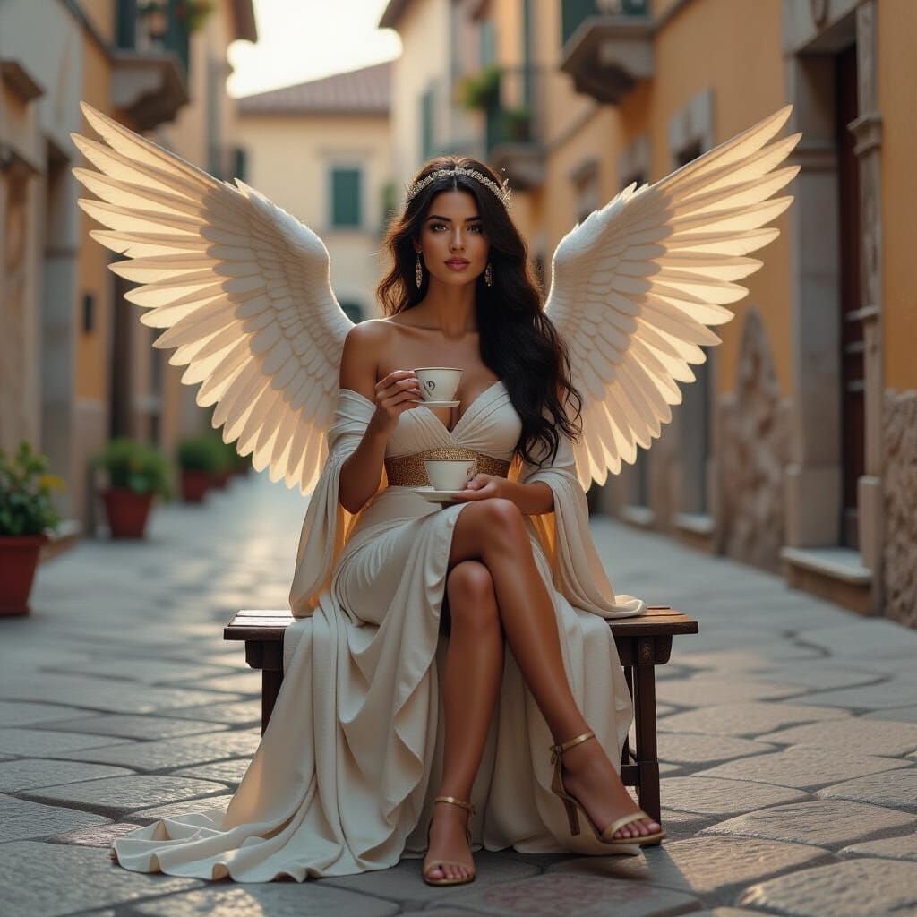 A digital painting of Nike, the winged goddess of victory, drinking tea in an ancient street. The image has vibrant colors, high contrast, film grain, and cinematic lighting. A surreal and fantasy aesthetic.