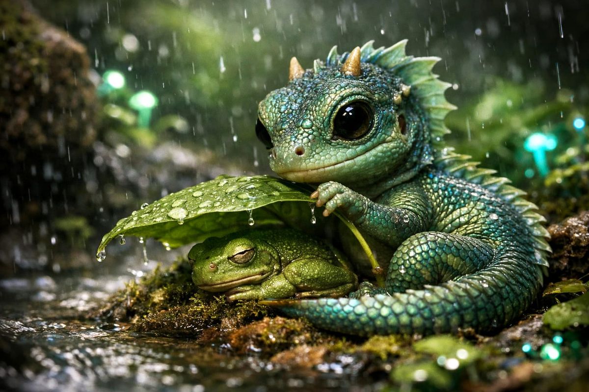 This hyper-realistic image shows a cute baby basilisk protecting a sleeping frog from rain beside a brook. Bioluminescent plants and magical mist create a serene, detailed scene with volumetric lighting.