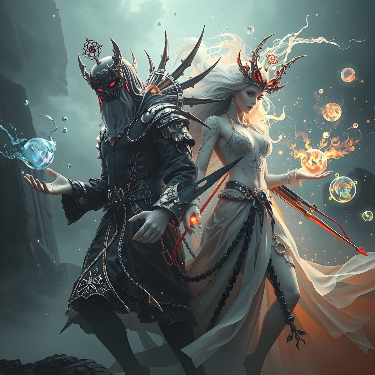 This image shows matter and antimatter depicted as fictional characters. The image features deep colors, intricate details and complementary colors, rendered as concept art in 8k resolution.