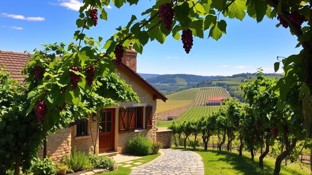 This idyllic image captures a serene vineyard scene with a cozy cottage, surrounded by lush greenery, grapevines, and a tranquil blue sky.