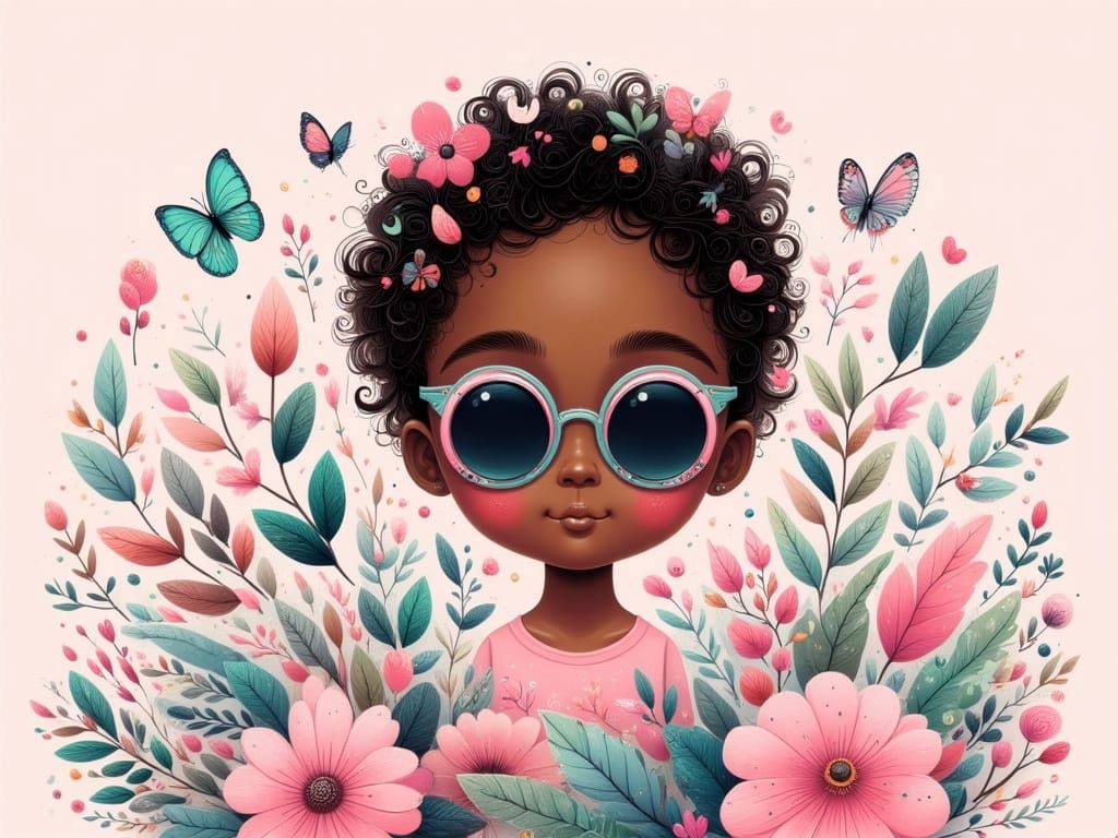 This image depicts a cute African American child wearing sunglasses. The illustration is rendered in delicate pastel colors, giving it a soft and appealing aesthetic.