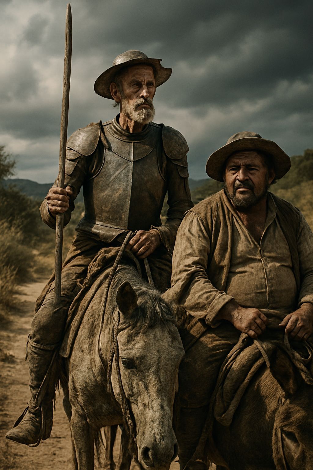 A hyperrealistic image of Don Quixote and Sancho Panza in the Spanish countryside. The cinematic shot emphasizes intricate details, high contrast, and atmospheric mood, portraying the characters dusty from travel.