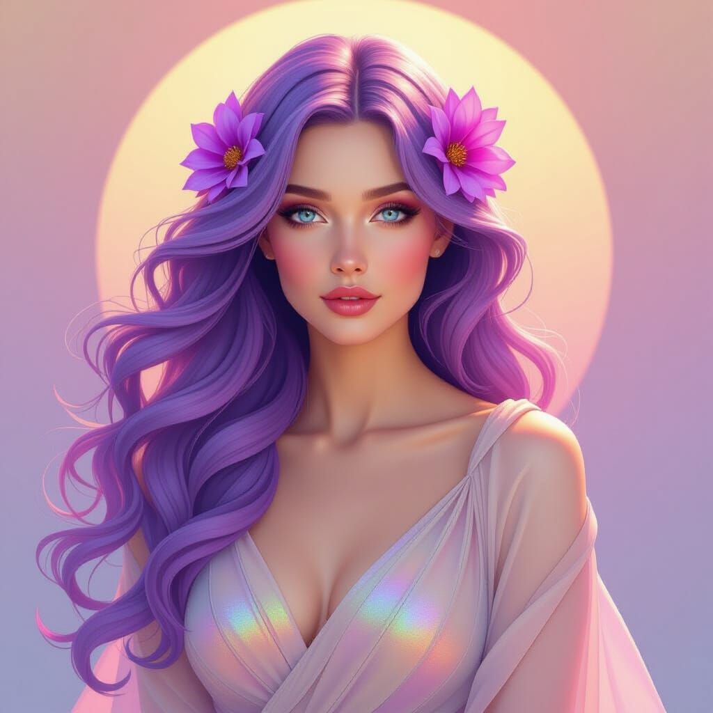 "A captivating digital painting in the style of Art Nouveau depicts a fair-skinned woman with mesmerizing blue eyes, her flowing hair a cascade of pastel shades interwoven with a single, vibrant purple flower. She is elegantly draped in a translucent gown that shimmers with a spectrum of multicolored ...