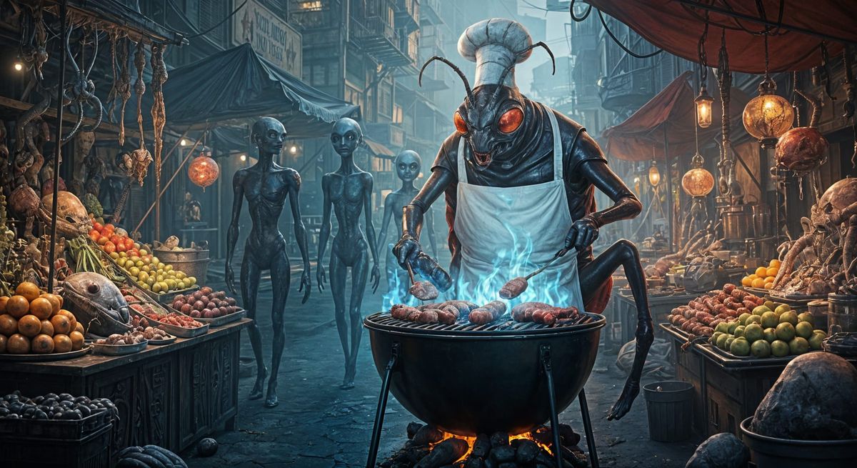 This image shows an alien insectoid chef preparing meat on a barbecue in a Martian street market, complete with blue flames. Strange aliens wander past stalls selling unusual fruits and artifacts. The scene is cinematic and dramatically lit.