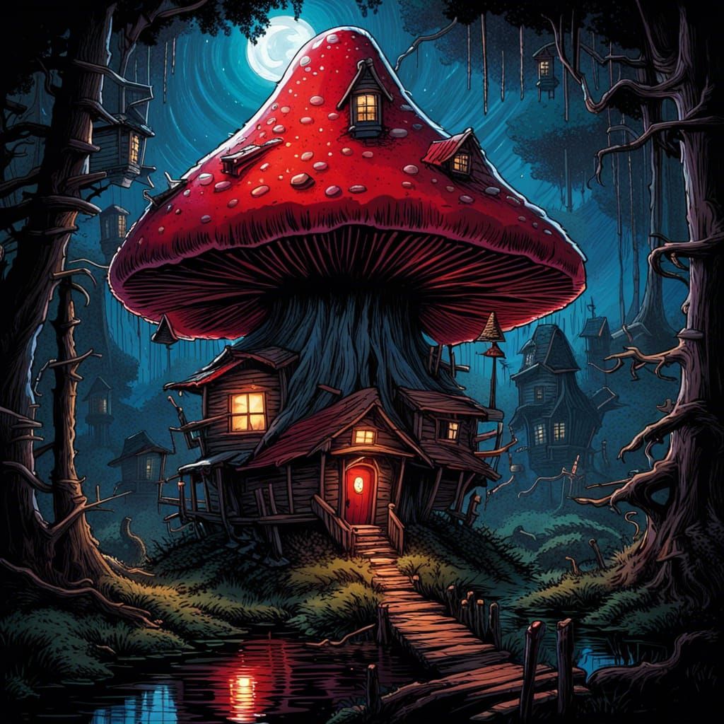 A whimsical high gothic village of treehouses nestled within a giant toadstool mushroom in a swamp. The scene is bathed in the light of a bright, starry night sky in a comic book art style.