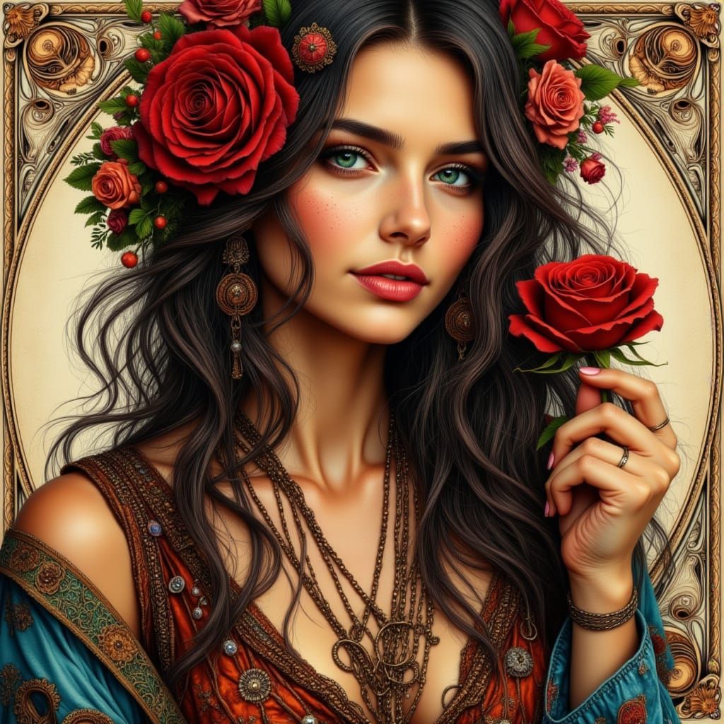This image shows a smiling German woman with wavy dark hair and green eyes smelling a red rose. She is wearing layered clothing against an Art Nouveau background.
