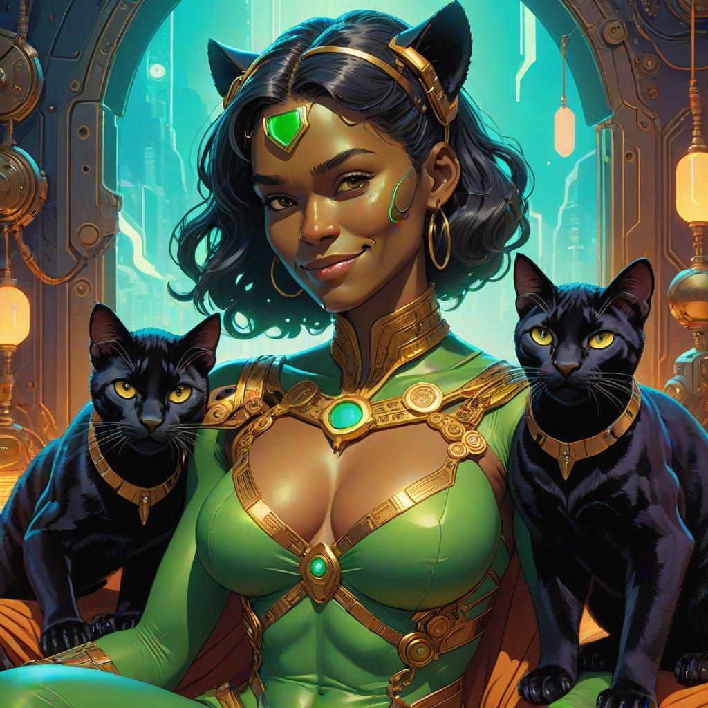 This image is a stunning example of immersive sci-fi artwork, featuring a serene and elegant She-Hulk surrounded by a smiling black panther kitten, set against a softly diffused background with a warm glow. The detailed attire and intricate design elements, including gold bicep cuffs and flowing robes, a...
