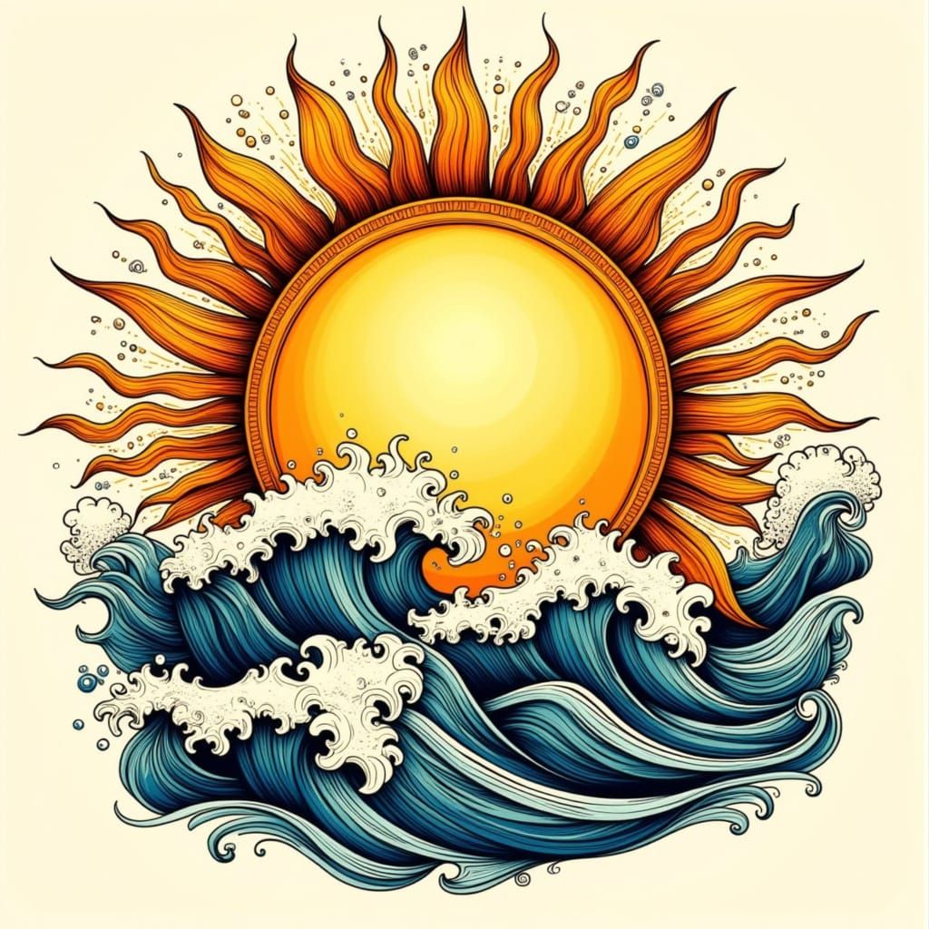 A striking image of a Neo-traditional sun with ornate rays and a stylized ocean wave, rendered in a vintage ink tattoo style with bold outlines and smooth shading.