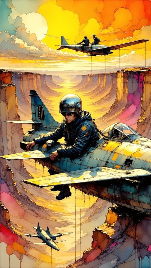 <lora:Ink Poet:1.0> <lora:Akimora:1.0> 1950s comic book illustration. Wide shot. A squadron of futuristic fighter pilots wearing silver helmets and black leather jackets are flying through the Grand Canyon in rocket powered biplanes. The style is reminiscent of classic noir comics, with bold lines and ...