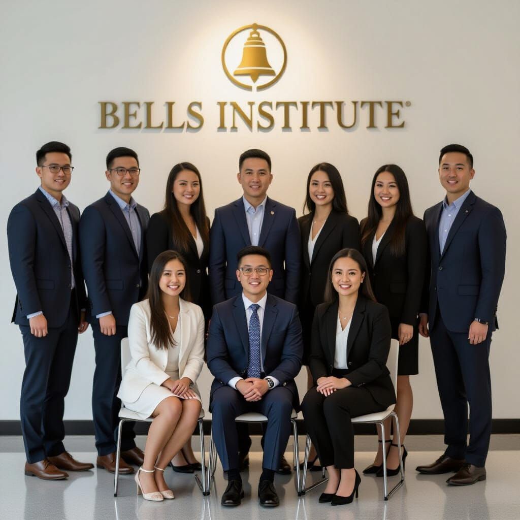 This image showcases a professional group photo of young adults in formal attire, arranged in three rows before the Bells Institute signage. Captured with cinematic lighting and sharp focus, resembling high-detail professional photography.