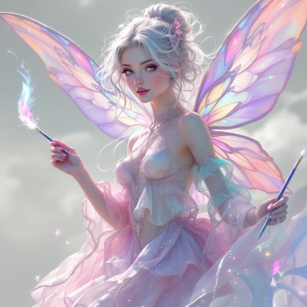 This image shows a whimsical fairy adding color to a monochromatic sky with her brush, her wings shimmering with a kaleidoscope of colors, inspired by the dreamy style of Brian Froud and the delicate textures of Kinuko Y. Craft