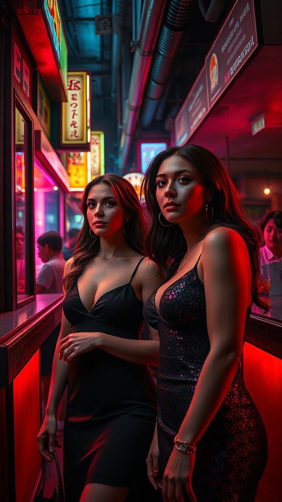 This image captures the essence of a vibrant nightlife scene, with women in stylish evening attire surrounded by dimly lit bars and neon lights, set against a backdrop of cinematic lighting and hyperrealistic details.