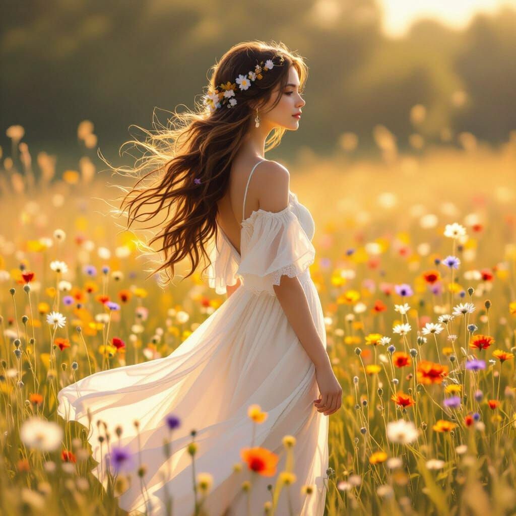 This image shows a woman with long hair in a meadow, wearing a white dress. Surrounded by flowers and bathed in sunlight, it evokes dreamy digital art and Art Nouveau styles.