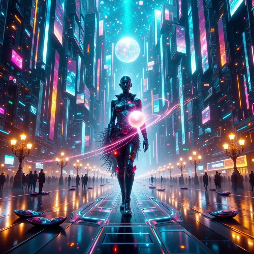 This image depicts a densely populated futuristic cityscape with sleek skyscrapers, holographic advertisements, and hovering vehicles, set against a backdrop of mesmerizing neon hues and bioluminescent trails, blending technology and mystery in a captivating cyberpunk aesthetic.