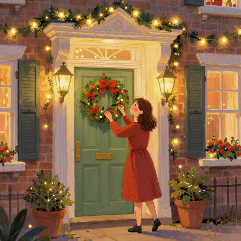 This image shows a joyful woman placing a Christmas wreath on a sage green door, surrounded by a house adorned with festive fairy lights. Rendered in a whimsical, softly illustrated cartoon style.